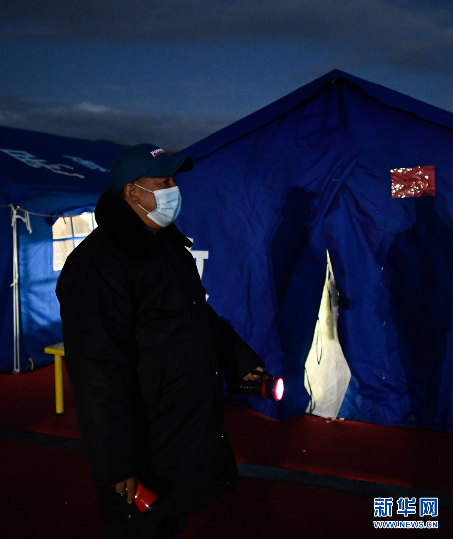 5月23日夜間,李加才讓在瑪多縣民族寄宿制中學(xué)操場的學(xué)生營地巡查。新華社記者 張龍 攝