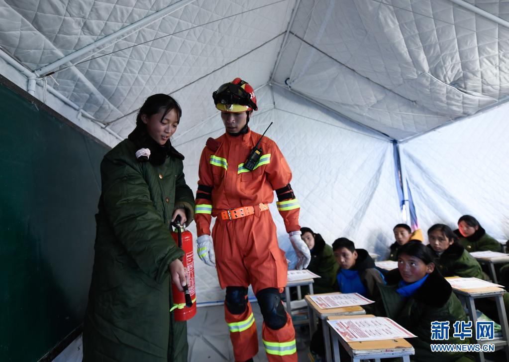 5月24日,青海果洛州消防救援支隊(duì)隊(duì)員在指導(dǎo)曲邁卓瑪(左一)學(xué)習(xí)防災(zāi)避險(xiǎn)知識。新華社 張龍 攝