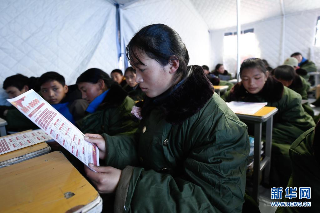 5月24日,曲邁卓瑪在瑪多縣民族寄宿制中學(xué)帳篷教室里學(xué)習(xí)防災(zāi)避險(xiǎn)知識。新華社 張龍 攝