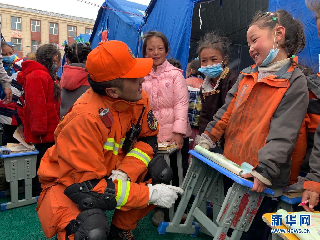5月25日,青海省玉樹藏族自治州消防救援支隊消防員群英尕丁(左)在瑪多縣民族寄宿制中學(xué)的安置區(qū)與學(xué)生交談。 新華社記者 解統(tǒng)強(qiáng) 攝