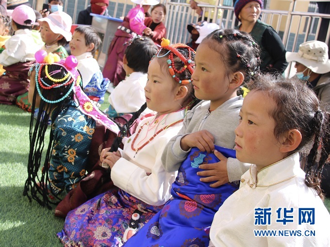 今年的“六一”活動上,貢巴幼兒園的小朋友們表演了藏族歌舞、《三字經(jīng)》朗誦等精彩節(jié)目。小男孩們穿上藏袍、戴上氈帽,活潑地跳起鍋莊。小女孩們盛裝打扮,頭上用彩色頭繩編滿了小辮兒,腰間特色銀飾叮當(dāng)作響。親子互動游戲笑聲不斷,欄桿外的老阿媽看得興致盎然。