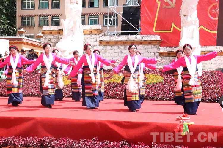 活動現(xiàn)場,黨旗國旗飄揚、哈達(dá)傳情,在一片歡騰的海洋里,大家載歌載舞齊唱光輝歲月,放聲歌頌幸福美好生活,盡情抒發(fā)高城兒女的愛黨愛國情懷。歌曲《翻身農(nóng)奴把歌唱》《草原上升起不落的太陽》,穿插吉祥老人頌詞和舞蹈。表達(dá)高原兒女在中國共產(chǎn)黨的領(lǐng)導(dǎo)下,翻身獲得解放,掌握了自己的命運。短短幾十年的發(fā)展過程,涉藏州縣迎來騰飛,經(jīng)濟(jì)社會發(fā)生了翻天覆地的變化,與祖國同步實現(xiàn)全面小康。