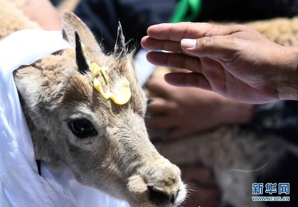 7月7日,在可可西里索南達(dá)杰保護(hù)站野生動物救助中心,可可西里巡山隊員按照風(fēng)俗為放歸的藏羚羊戴上哈達(dá)表達(dá)祝福。新華社記者 張龍 攝