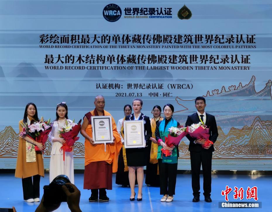 7月13日,青海省黃南藏族自治州同仁市麻巴寺新修建的扎西多卡瑪?shù)?3日正式落成,并被世界紀(jì)錄認證機構(gòu)(WRCA)認證為彩繪面積最大的單體藏傳佛殿建筑和最大的木結(jié)構(gòu)單體藏傳佛殿建筑。據(jù)悉,新修建的扎西多卡瑪?shù)睿ㄗ诳Π偷睿﹥?nèi)外均以礦石原料和植物原料手工彩繪,面積為5883.48平方米,該殿被確認為“世界彩繪面積最大的單體藏傳佛殿建筑”,該殿主體為木制結(jié)構(gòu)的重檐歇山頂式建筑,占地面積為540余平方米,長27米、寬21米、高16米,共三層,該殿被確認為“世界最大的木結(jié)構(gòu)單體藏傳佛殿建筑”。
