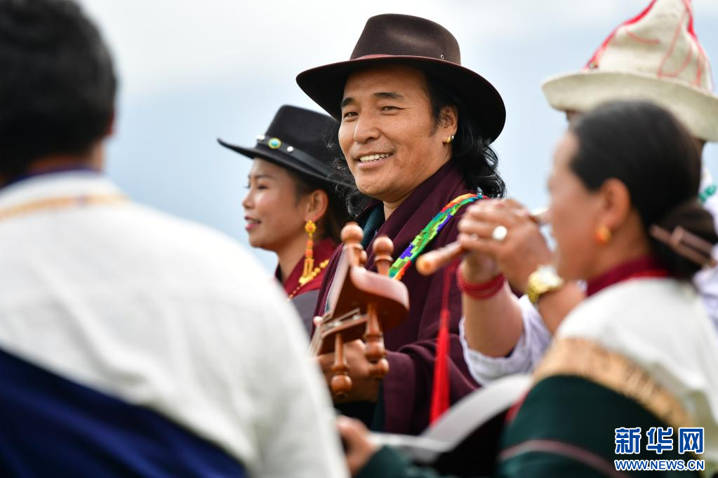 格薩爾彈唱藝人旦知吉(左)在瑪曲草原上彈唱格薩爾(7月14日攝)。新華社記者 杜哲宇 攝