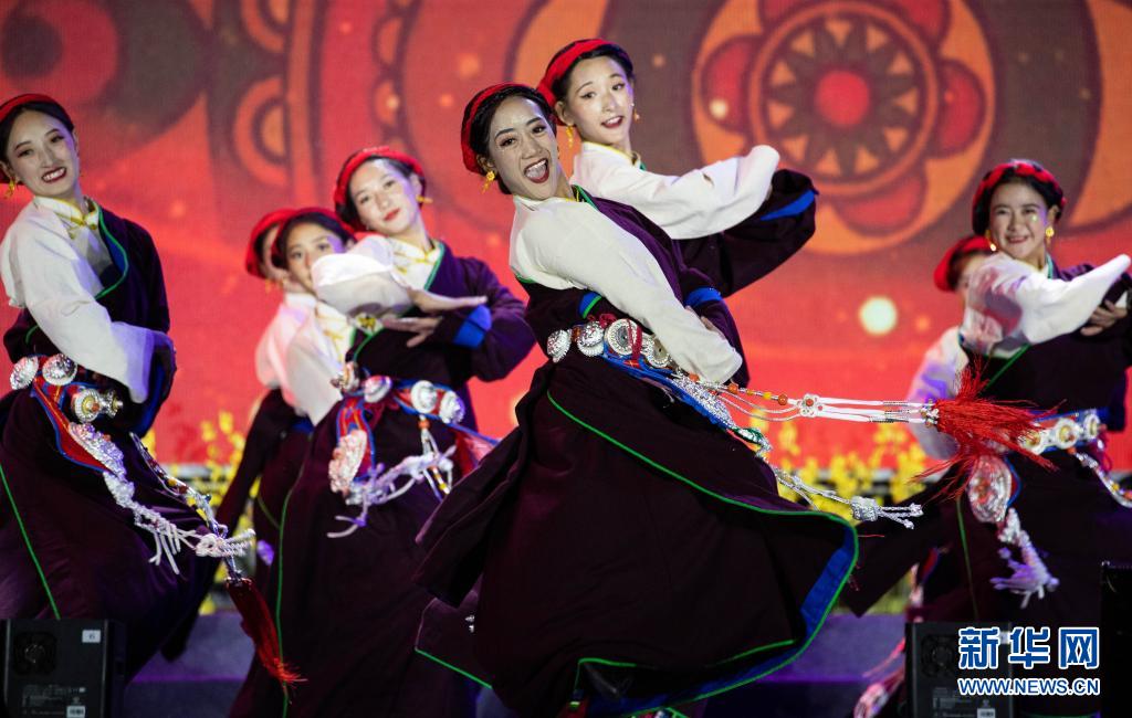 7月23日,在道孚縣縣城,演員們?cè)谖枧_(tái)上表演。新華社記者 江宏景 攝