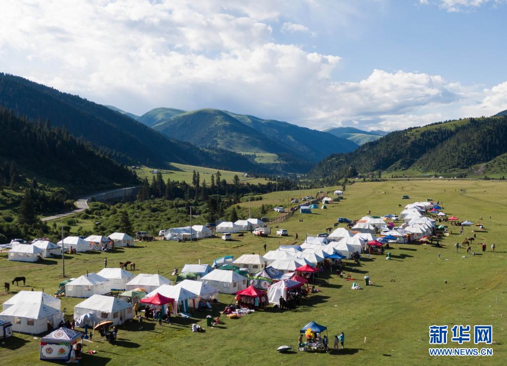 7月22日,人們?cè)诘梨诳h玉科草原上搭起帳篷休閑(無人機(jī)照片)。新華社記者 江宏景 攝