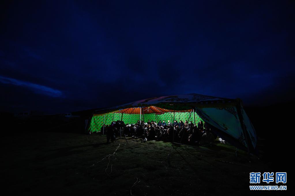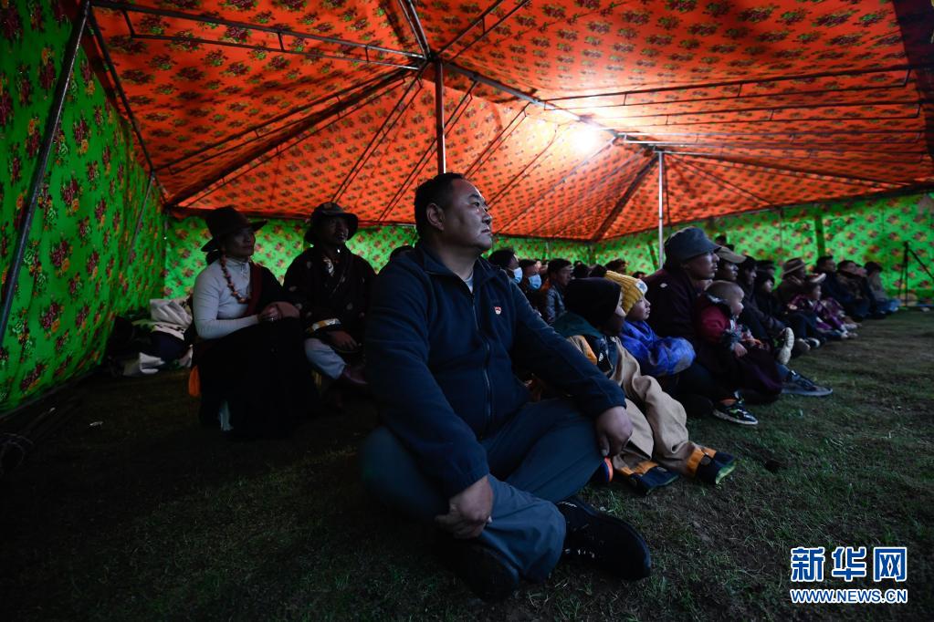 8月3日,在瑪沁縣當(dāng)洛鄉(xiāng)貢龍村的夏季草場(chǎng)上,南拉才讓(前排左一)和牧民一起看電影。新華社記者 張龍 攝