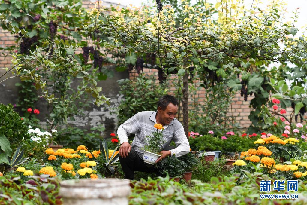 8月5日,魏金明在玉樹市結(jié)古鎮(zhèn)新寨村的蔬菜基地整理葡萄架。新華社記者 吳剛 攝