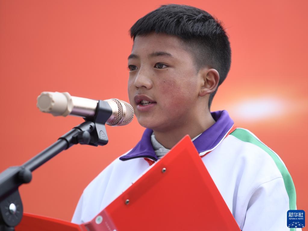 9月1日,在位于果洛藏族自治州瑪沁縣的瑪多地震災(zāi)后過(guò)渡安置一校區(qū),學(xué)生科熱在國(guó)旗下講話(huà)。新華社記者 張龍 攝