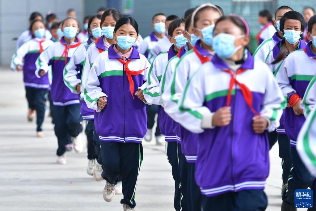 9月1日,在位于果洛藏族自治州瑪沁縣的瑪多地震災(zāi)后過(guò)渡安置一校區(qū),學(xué)生在跑步。新華社記者 張龍 攝