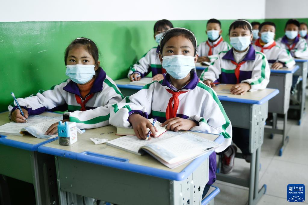 9月1日,在位于果洛藏族自治州瑪沁縣的瑪多地震災(zāi)后過(guò)渡安置一校區(qū),學(xué)生在上開(kāi)學(xué)第一課。新華社記者 張龍 攝