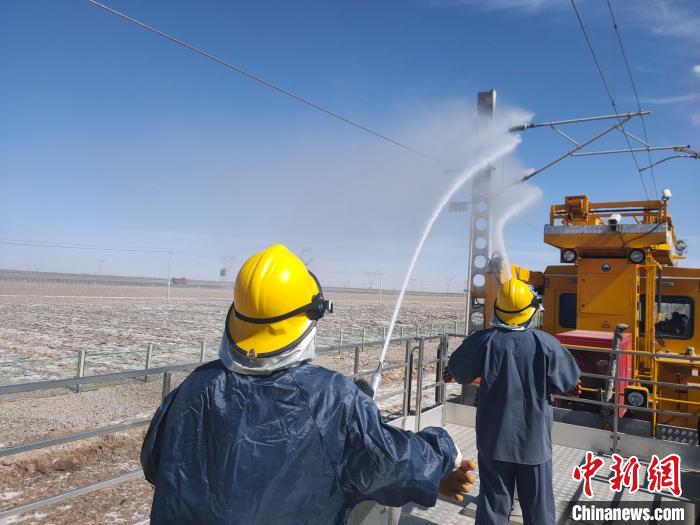 圖為接觸網(wǎng)清洗車在清洗鹽污區(qū)段的接觸網(wǎng)絕緣子。周賀 攝