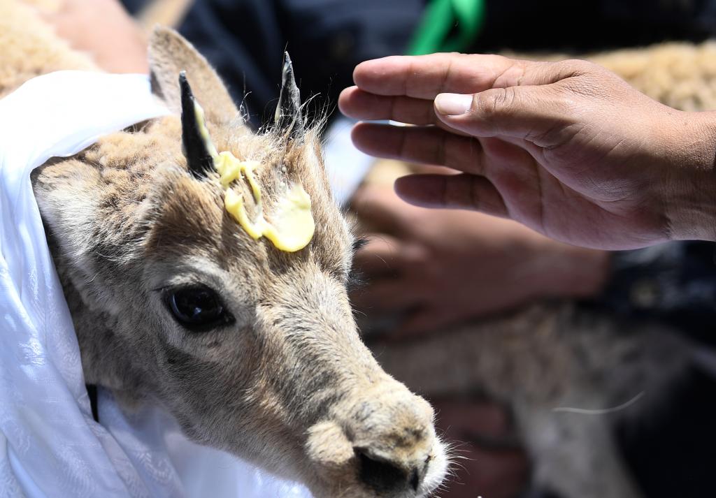 7月7日,在可可西里索南達(dá)杰保護(hù)站野生動(dòng)物救助中心,可可西里巡山隊(duì)員按照風(fēng)俗,在即將回歸大自然的藏羚羊額頭上涂抹酥油表達(dá)祝福。 新華社記者 張龍攝