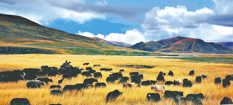 圖為10月10日,宜牛鄉(xiāng)牧民在太陽湖旁放牧點(diǎn)放養(yǎng)牦牛。 根呷 攝