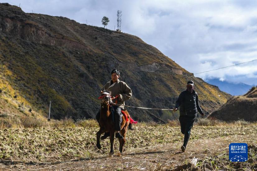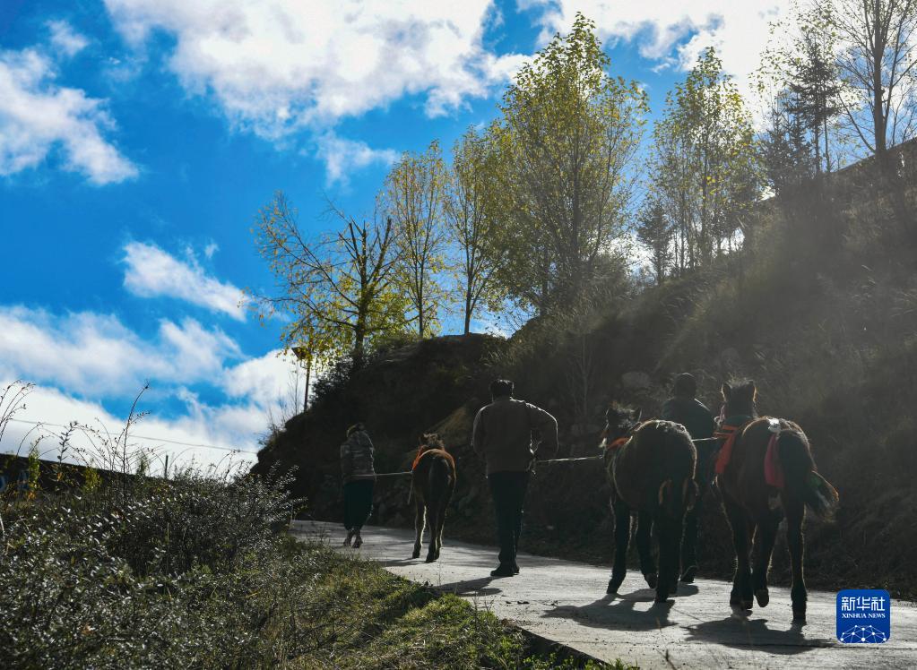 在甘孜縣來馬鎮(zhèn)格通村,村民將完成馴化訓(xùn)練后的幼馬帶回(10月25日攝)。新華社記者 王曦 攝