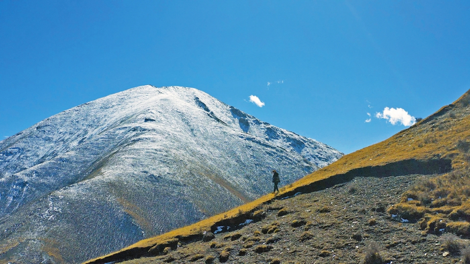 10月23日早晨,姜楠備好望遠鏡、相機、水,準備上山,同行的還有藏族同事扎拉和一位藏族牧民,任務是為云塔村3座小山上的紅外相機更換電池。這里的山并不高,但因高原氧氣稀薄,增添攀登難度。山間未完全融化的雪跡,也讓山路濕滑難走。