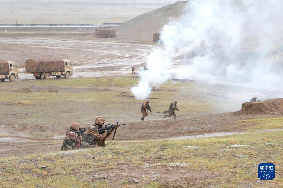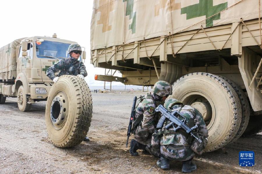 聯(lián)勤保障部隊汽車運(yùn)輸某團(tuán)一營一連參加高原駐訓(xùn)時,在行車途中組織官兵進(jìn)行防衛(wèi)演練(2020年6月16日攝)。新華社發(fā)