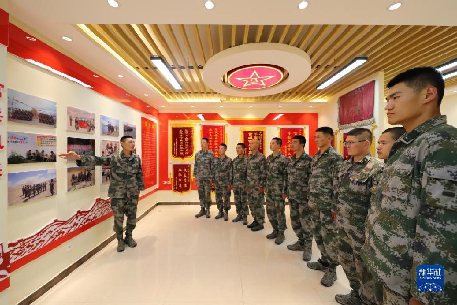 聯(lián)勤保障部隊汽車運(yùn)輸某團(tuán)一營一連連長孟凡龍(左一)為新兵講述連隊歷史(7月11日攝)。新華社發(fā)