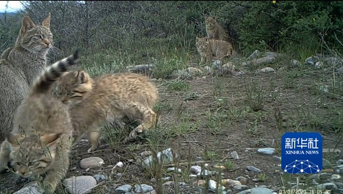 這是布設(shè)在祁連山國(guó)家公園青海片區(qū)的紅外相機(jī)拍攝到的5只荒漠貓同框畫(huà)面(2020年7月3日攝)。新華社發(fā)(祁連山國(guó)家公園青海省管理局供圖)