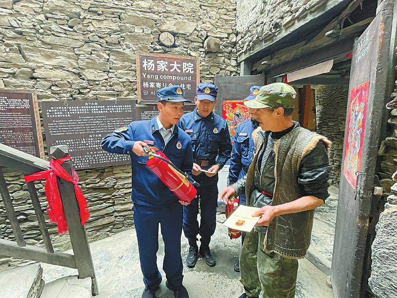 在被譽為“羌族建筑藝術活化石”的桃坪羌寨,羌族每家都設“火塘”,羌寨內(nèi)部采用木材構(gòu)造,稍有不慎極易引發(fā)火災。到寨子組織滅火演練、開展防火巡查、宣傳消防知識、提供便民服務,就成了陳洪橋和戰(zhàn)友們每天雷不打不動的事,“一定要注意用火用電!”“老鄉(xiāng),請記得‘人走火滅’哦!”“你好,需要幫助嗎?”……這是他們每天不厭其煩對寨中群眾和游客重復最多的話。寨中每一條疏散通道、每一條暗溝水渠以及每一家房子結(jié)構(gòu)布局,消防員們都了然于胸、爛熟于心。