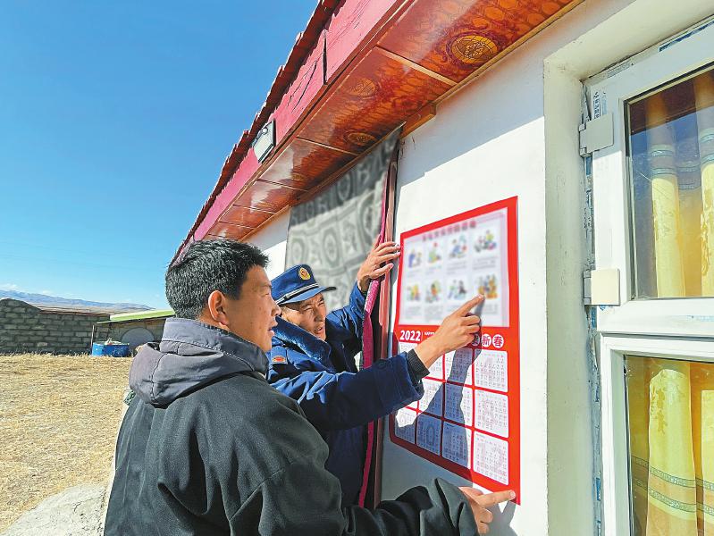 索郎更波(右)給牧民講解牧區(qū)消防知識。 阿壩州消防救援支隊供圖