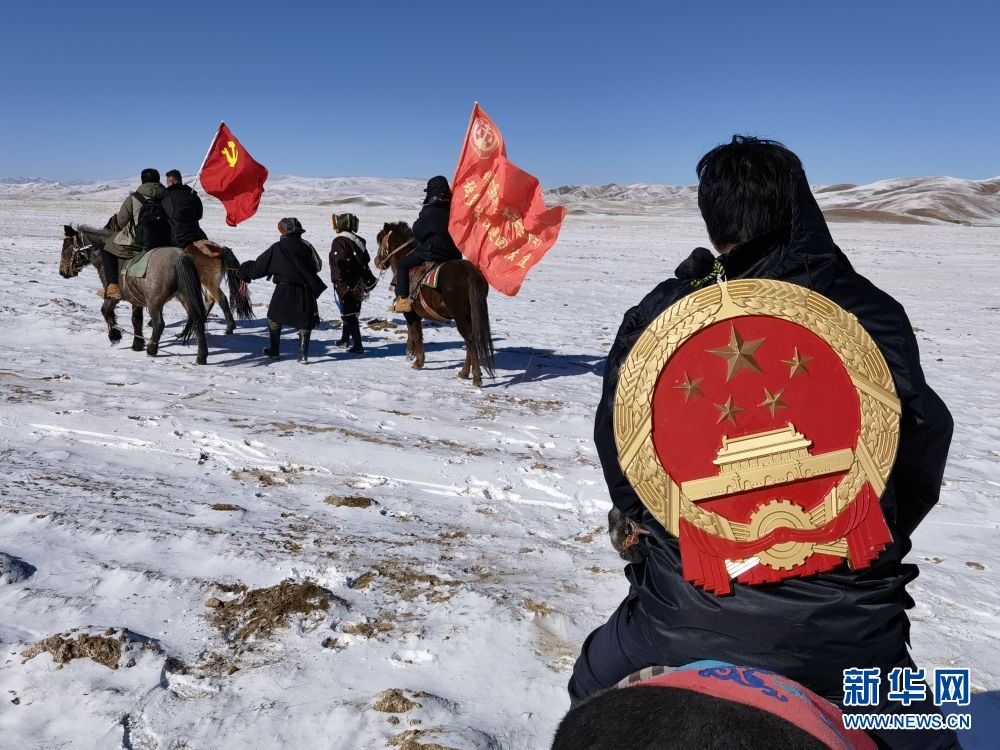 12月20日,青海省果洛藏族自治州瑪多縣人民法院院長(zhǎng)錢快乾(左一)在雪后草原上為當(dāng)?shù)啬羺^(qū)群眾普及法律知識(shí)。新華社記者 李寧 攝