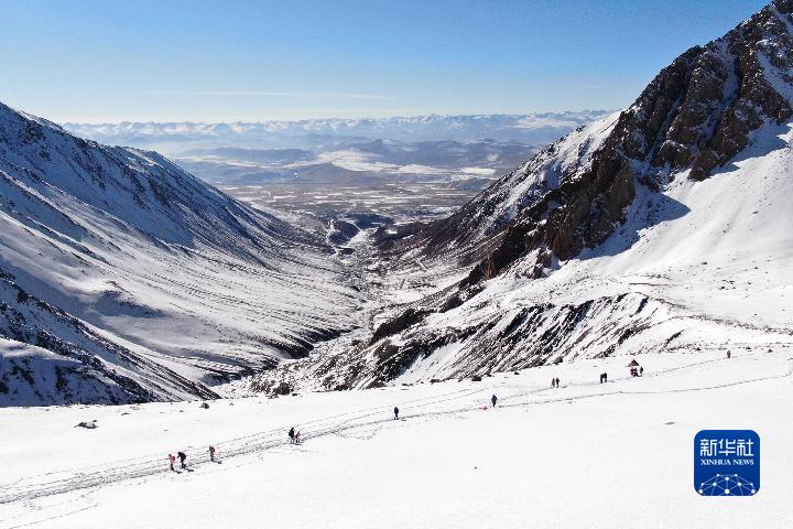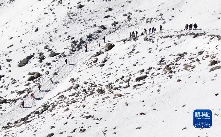 1月1日,登山愛好者攀登崗什卡雪峰(無(wú)人機(jī)照片)。
