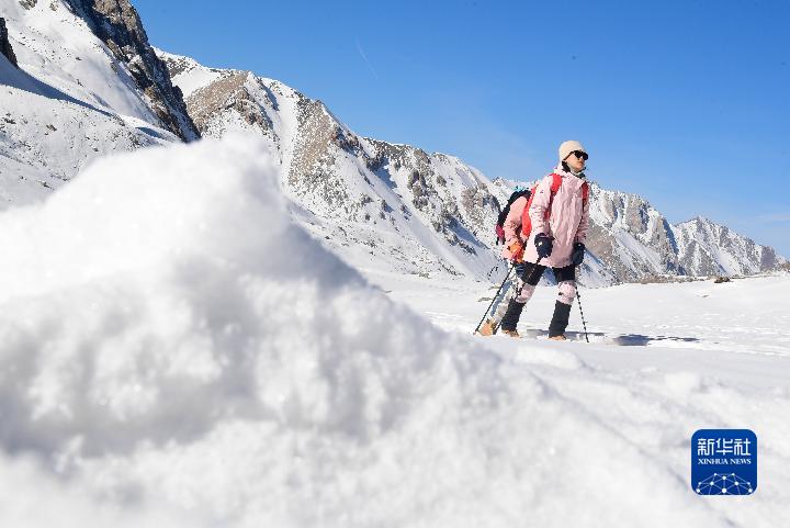 當(dāng)日,在青海省海北藏族自治州門源回族自治縣,登山愛好者們攀登崗什卡雪峰,在山巔和雪原中度過(guò)新年第一天。