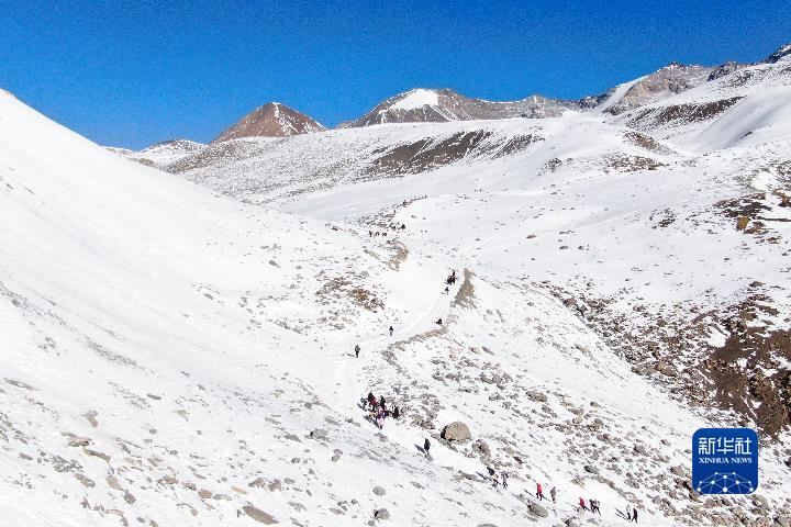 1月1日,登山愛好者攀登崗什卡雪峰(無(wú)人機(jī)照片)。新華社記者 王艷 攝