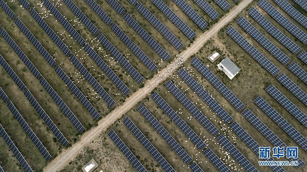 羊群在青海省海南藏族自治州共和光伏產(chǎn)業(yè)園吃草(無人機(jī)照片)。新華社記者 吳剛 攝
