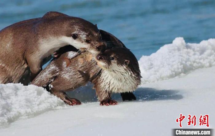 圖為鳥類調(diào)查期間,偶遇水獺母子在河邊捕魚。青海多美生態(tài)環(huán)??萍加邢薰?供圖