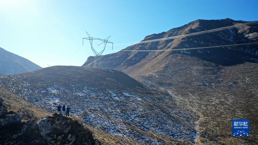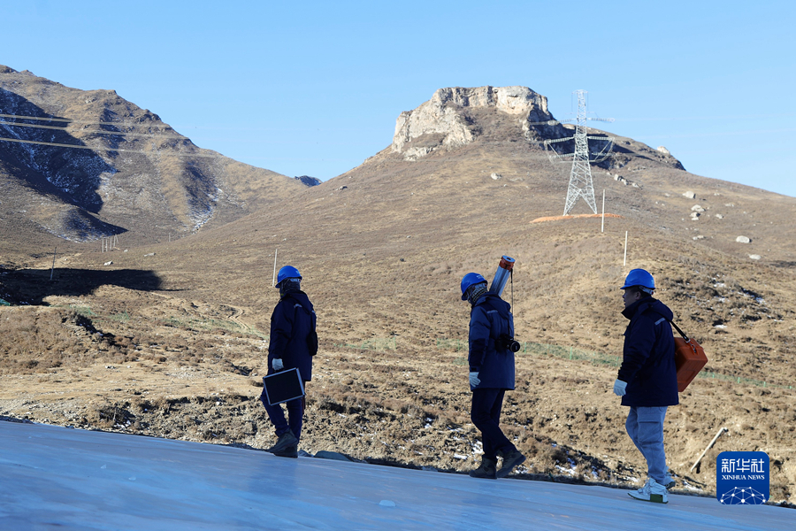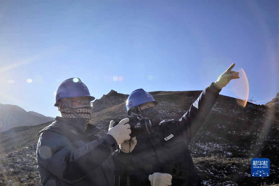 1月19日,國(guó)家電網(wǎng)青海省電力公司檢修公司輸電檢修中心專業(yè)班組成員在巡線途中查看線路運(yùn)行情況。新華社記者 趙玉和 攝
