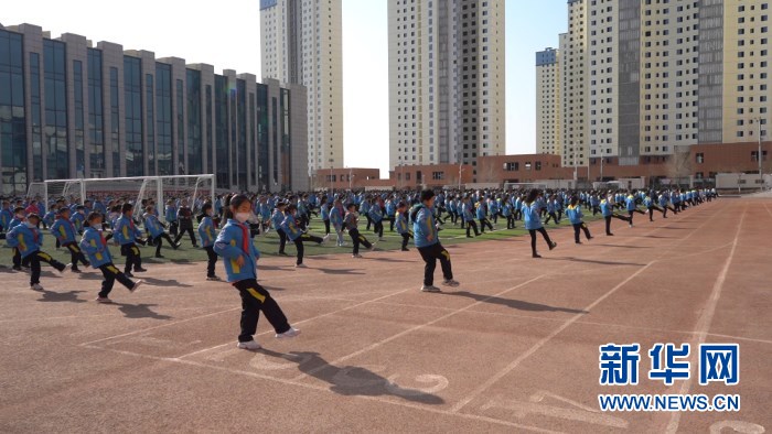 22日,蘭州新區(qū)第二小學學生們在操場上做課間操。新華社記者 王紫軒 攝