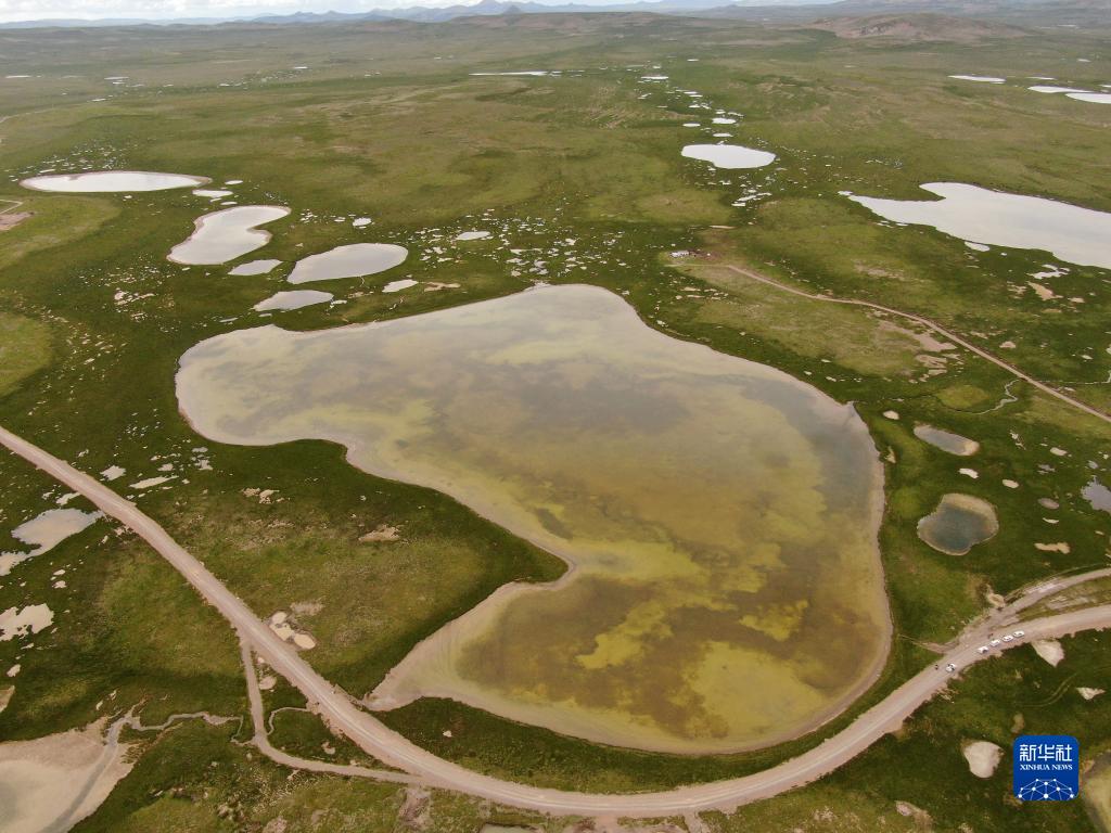 這是2021年7月23日拍攝的長(zhǎng)江源地區(qū)的查旦濕地(無(wú)人機(jī)照片)。新華社記者 張龍 攝