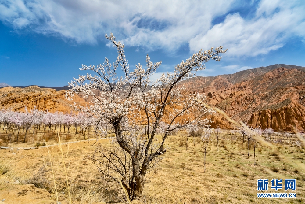 神奇的丹霞峽谷和一樹樹梨花構(gòu)成一幅色彩艷麗的油畫。新華網(wǎng) 宋忠勇 攝