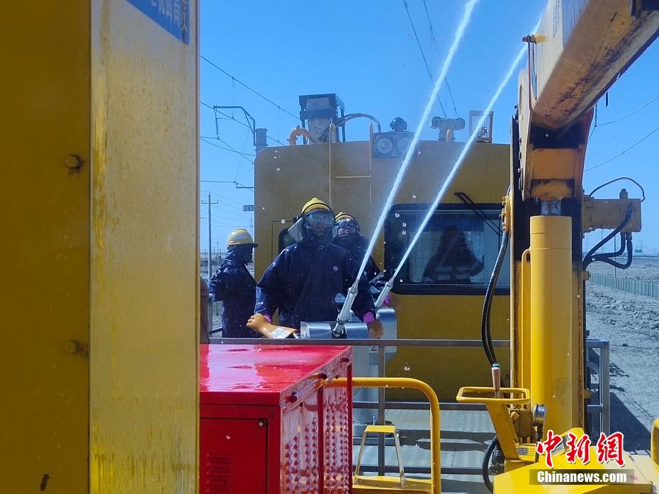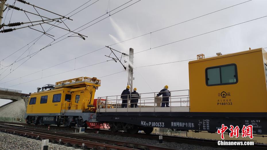 察爾汗鹽湖區(qū)域空氣中鹽分含量高,在這片區(qū)域,春秋季大風(fēng)不僅揚(yáng)沙還會(huì)揚(yáng)鹽,很容易在鐵路牽引供電接觸網(wǎng)設(shè)備上形成鹽污,造成線路跳閘,遇到雨雪天氣就會(huì)放電,造成大面積跳閘,誘發(fā)行車安全事故。圖為接觸網(wǎng)工操作水炮進(jìn)行清洗作業(yè)。 王文誠 攝