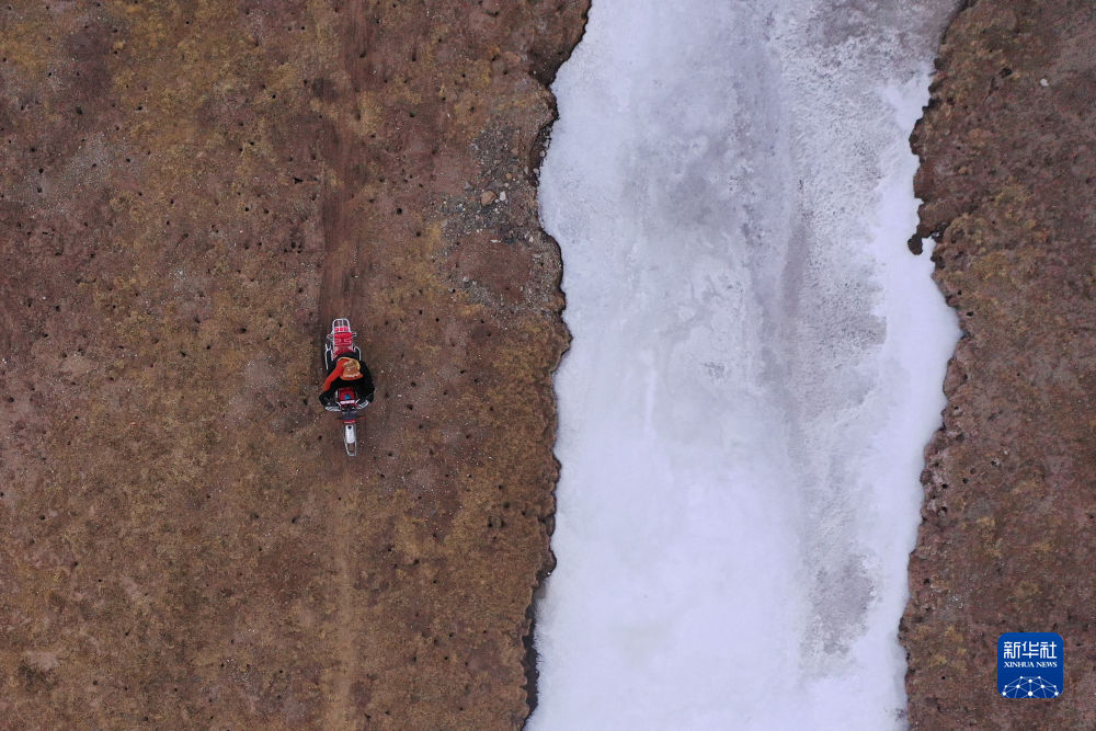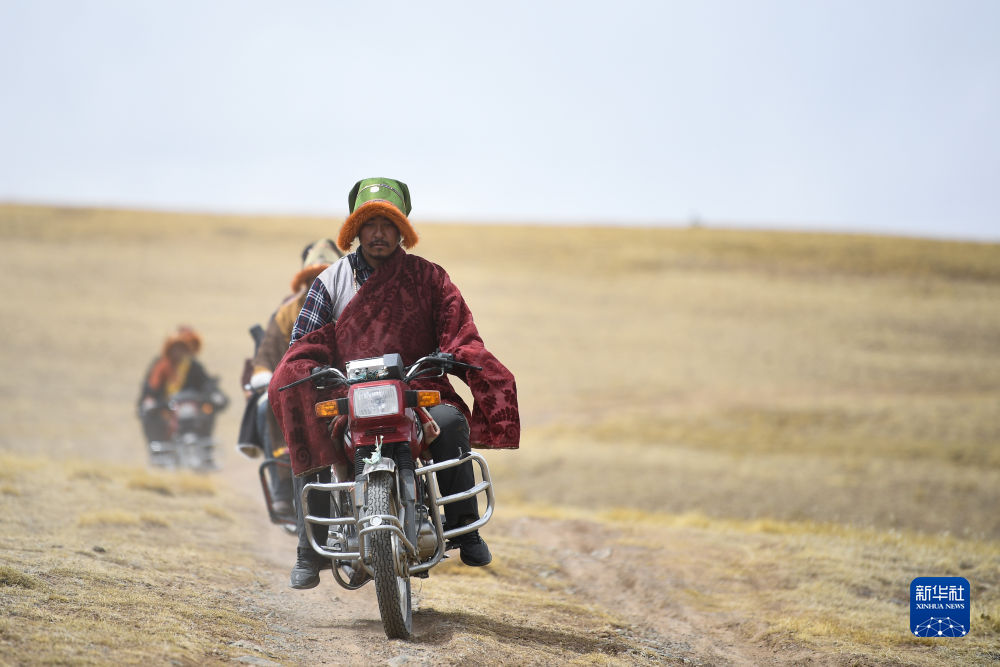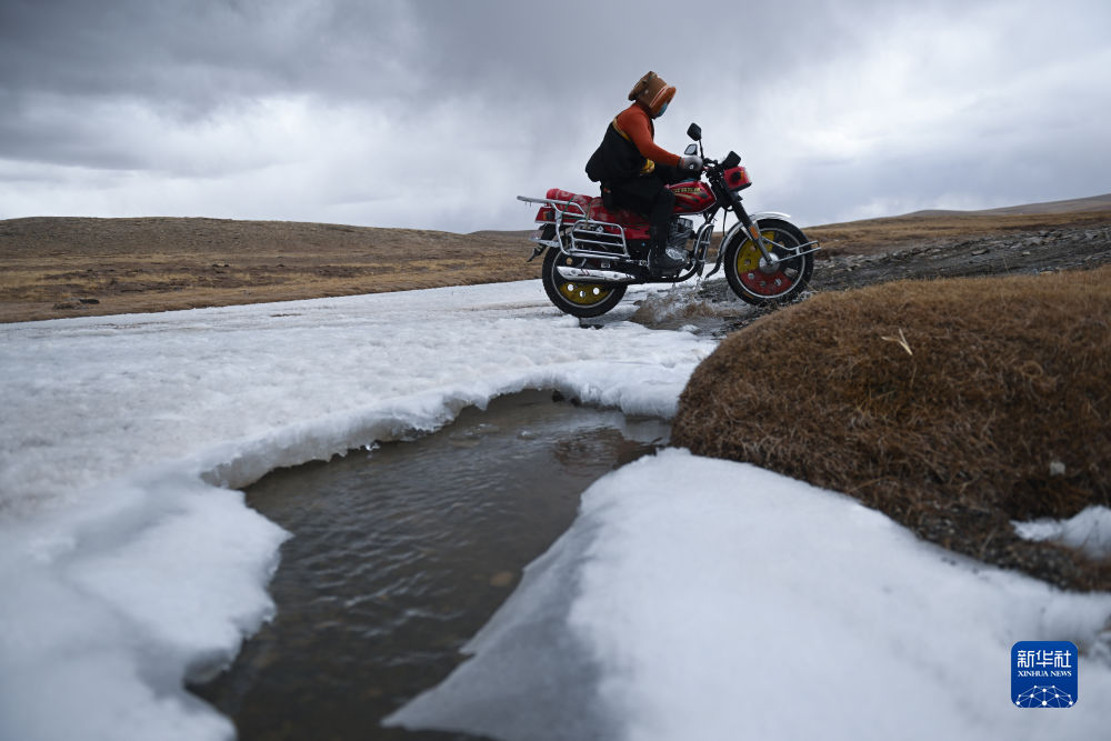 4月21日,在青海省玉樹藏族自治州曲麻萊縣麻多鄉(xiāng)約古宗列曲附近,生態(tài)管護(hù)員才仁扎西駕駛摩托車巡護(hù)。新華社記者 張龍 攝