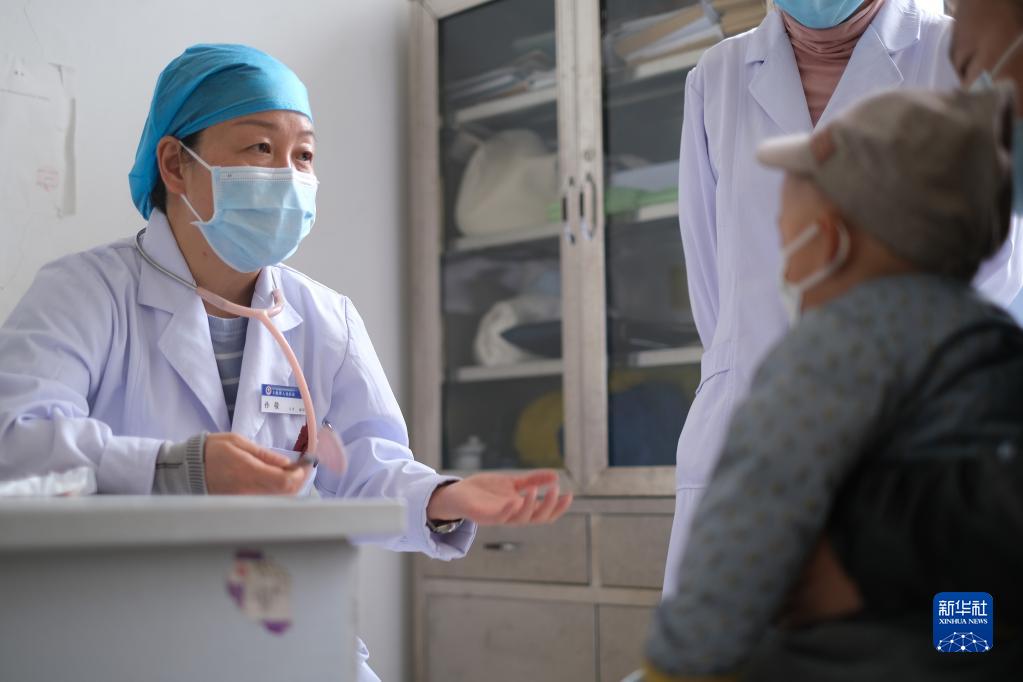 4月25日,青海省人民醫(yī)院醫(yī)生、青南支醫(yī)隊(duì)員王菲在青海省玉樹藏族自治州人民醫(yī)院給患者進(jìn)行檢查。新華社記者 韓方方 攝