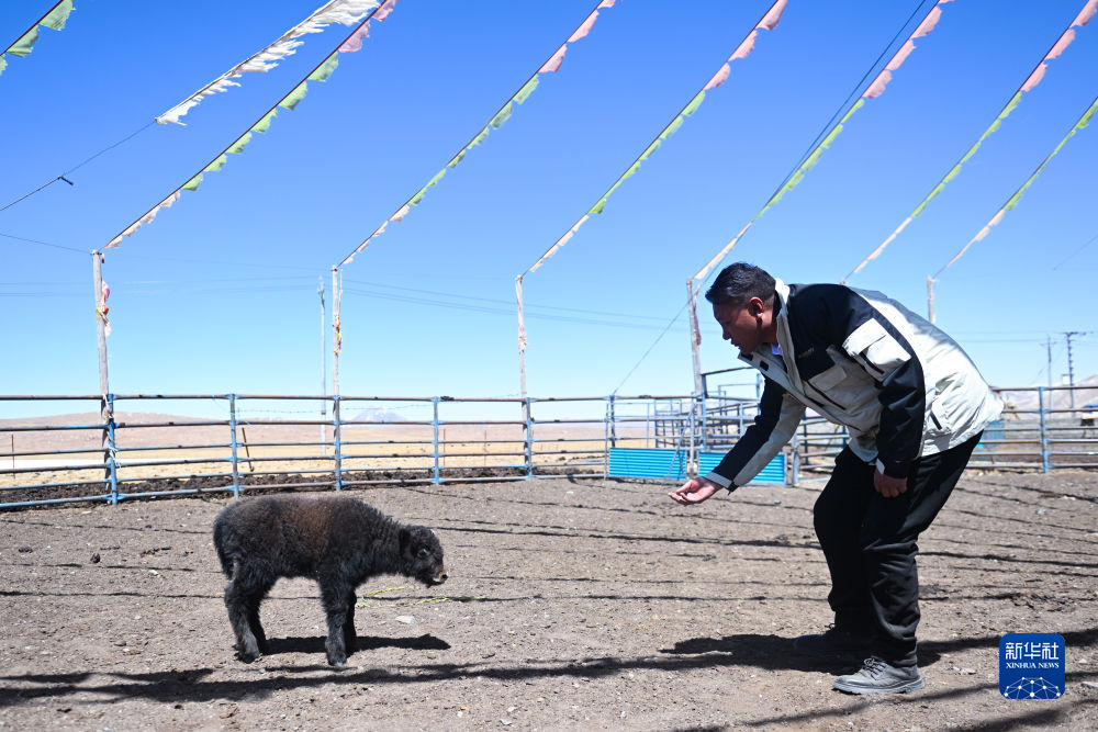 尼瑪才仁正在畜棚照顧小牛犢(4月20日攝)。新華社記者 柳澤興 攝