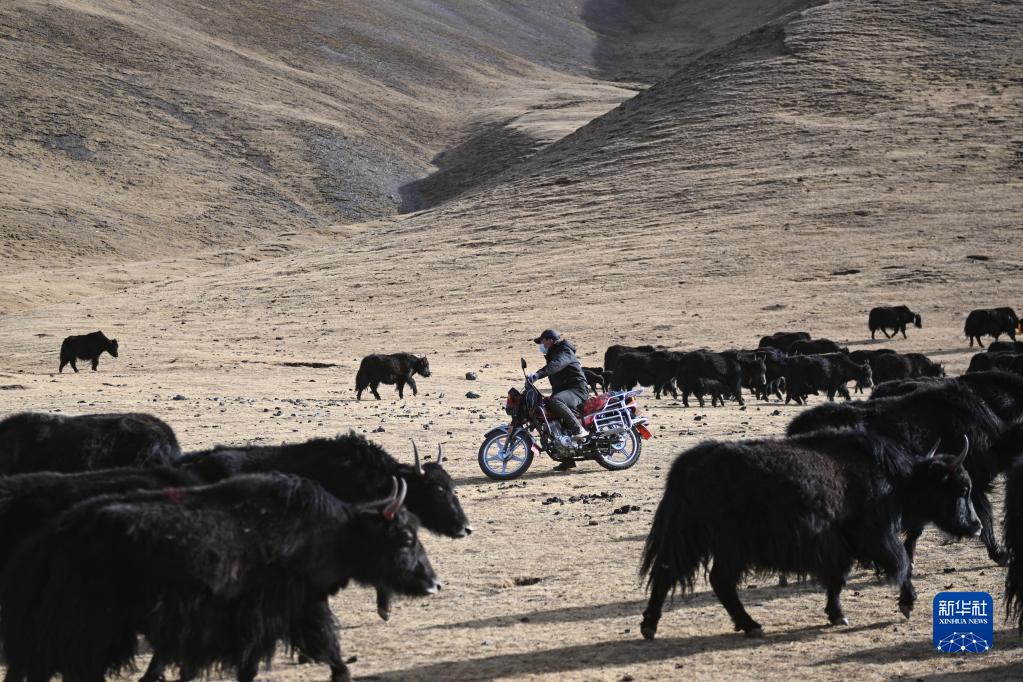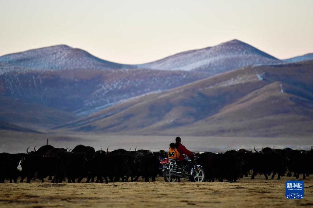 2020年10月28日,在青海省玉樹藏族自治州稱多縣珍秦鎮(zhèn),牧民騎著摩托車放牧。新華社記者 張龍 攝