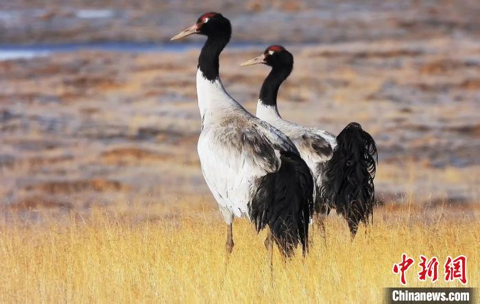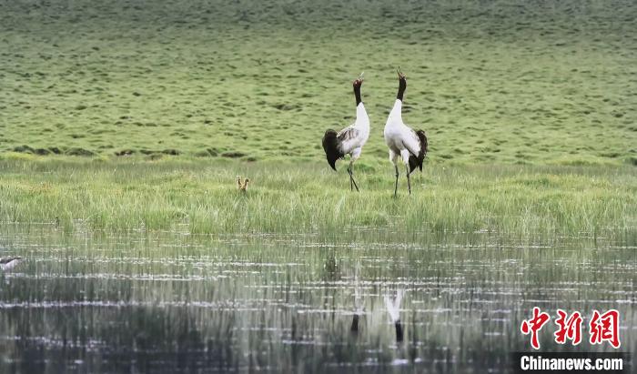 圖為黑頸鶴夫婦以高聲合鳴的方式宣誓領(lǐng)地,威懾入侵者。張景元 攝