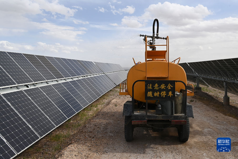 6月7日,在海西蒙古族藏族自治州德令哈市光伏(光熱)產(chǎn)業(yè)園的一家光伏電站,工作人員準(zhǔn)備駕駛車(chē)輛清潔光伏板。新華社記者 范培珅 攝
