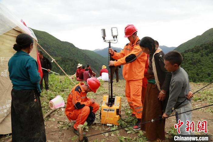 震中草登鄉(xiāng)斯拉爾底村三組安置點電力搶險人員架起照明設(shè)備,最后一個停電的受災(zāi)村莊燈亮了。張懿玲 攝