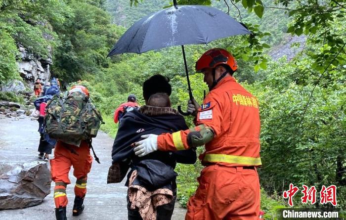 四川森林消防員撐起傘在雨中護送群眾轉(zhuǎn)移。四川森林消防供圖