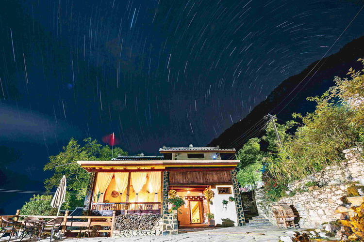 白天的色龍村,云霧飄浮在山腰,牛群慵懶地穿行于林間,恬靜閑適,及至餐時,炊煙裊裊,一派祥和。夜晚,靜謐的村莊被燈火次第點(diǎn)亮,像是墜落于高原山間的星河,璀璨耀眼,浪漫迷人。