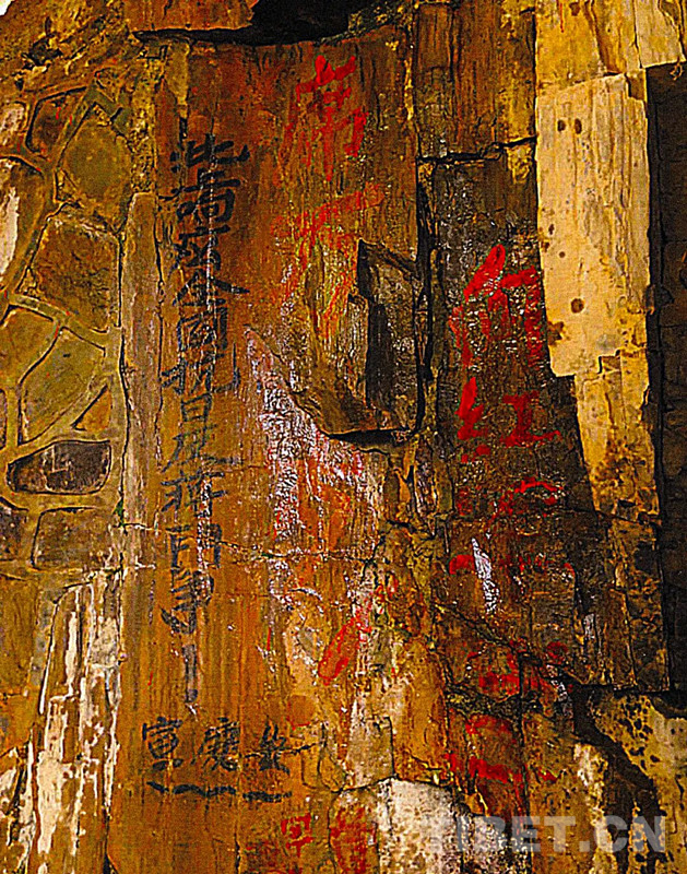 圖為一九三五年七月,中國工農(nóng)紅軍二方面軍第六軍團(tuán)在長征途中,曾路過班瑪、久治一帶,并在班瑪絨玉地區(qū)的森林石壁上刻下的“北上響應(yīng)全國抗日反蔣斗爭”的標(biāo)語