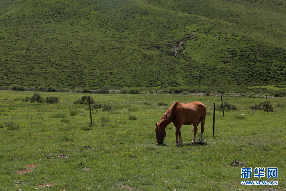 青海洮河源國家濕地公園內,一匹馬兒正在愜意地吃草。新華網 卡婭梅朵 攝