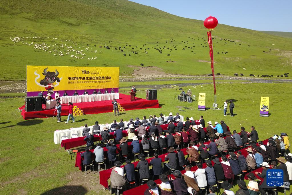 這是7月5日在稱多縣歇武鎮(zhèn)牧業(yè)村拍攝的玉樹牦牛進(jìn)北京出欄簽售活動現(xiàn)場(無人機(jī)照片)。新華社記者 范培珅 攝