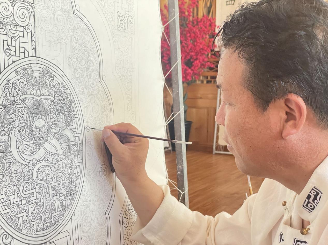 更登正在繪制白描圖案。人民網(wǎng) 況玉 攝